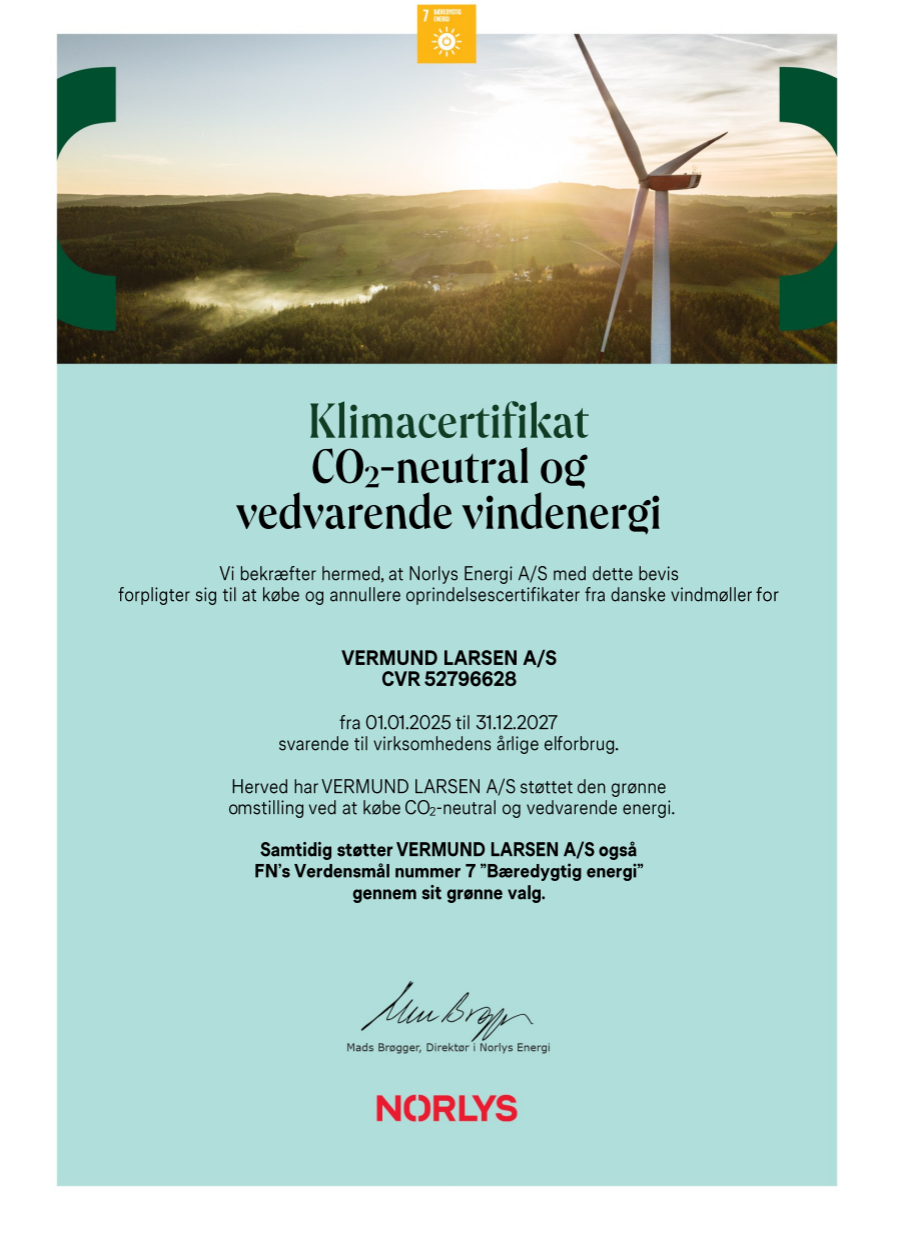 Bei Vermund Larsen A/S sind wir nach international anerkannten Standards für Umwelt und Qualität zertifiziert. Dies stellt sicher, dass wir bei unseren Prozessen und Methoden einen einheitlichen Ansatz verfolgen – und dass wir uns sowohl auf Qualitäts- als auch auf Umweltverbesserungen konzentrieren.