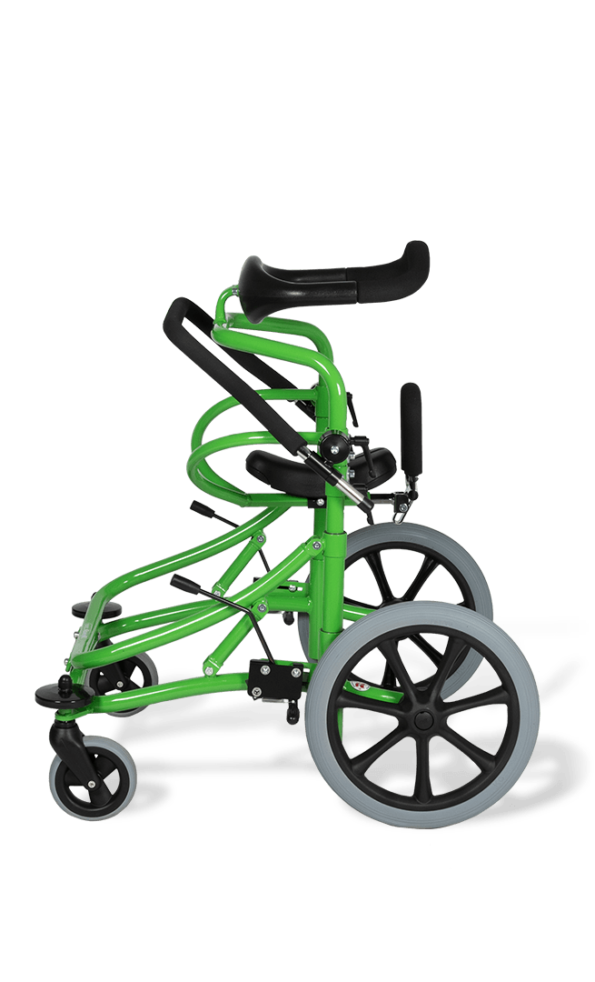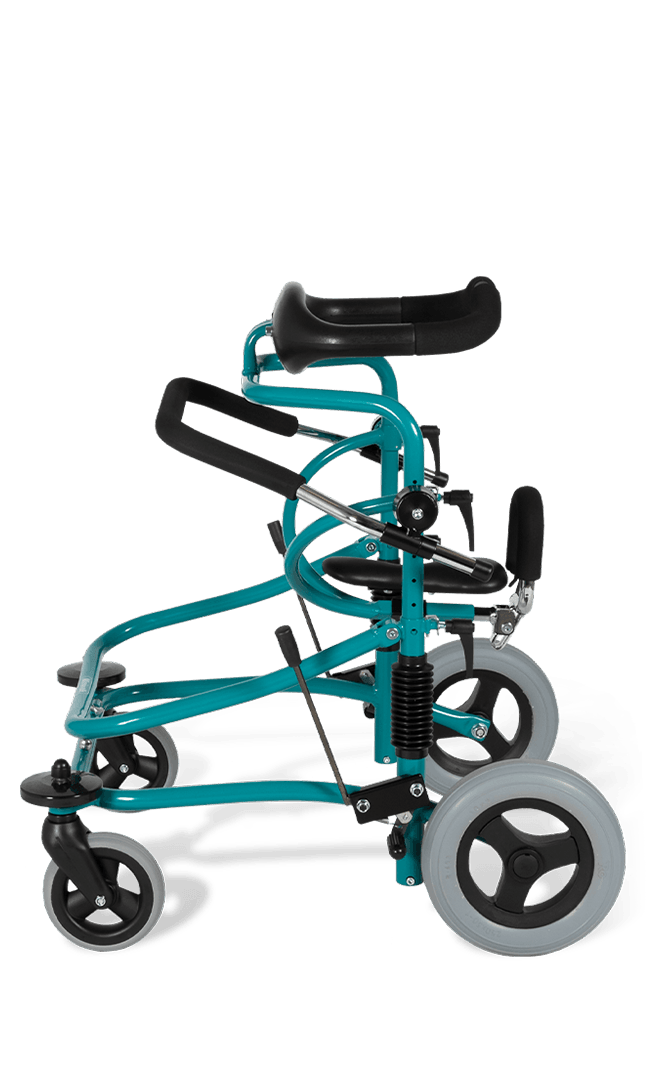 Der mit einem dynamischen Sitz und einem einzigartigen Federsystem ausgestattete Gehwagen passt sich den Bewegungen des Benutzers an und gewährleistet eine optimale Gewichtsverteilung. Der Thoraxring ermöglicht die Bewegung des Rumpfes und unterstützt gleichzeitig eine optimale aufrechte Haltung.